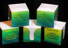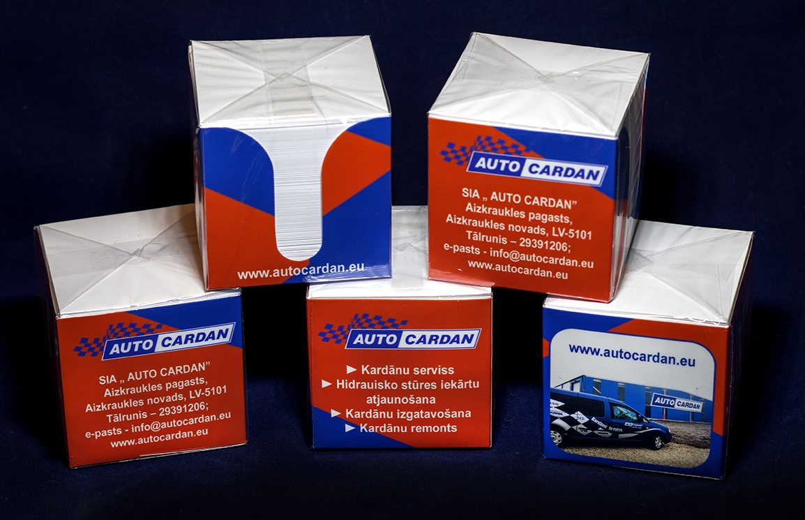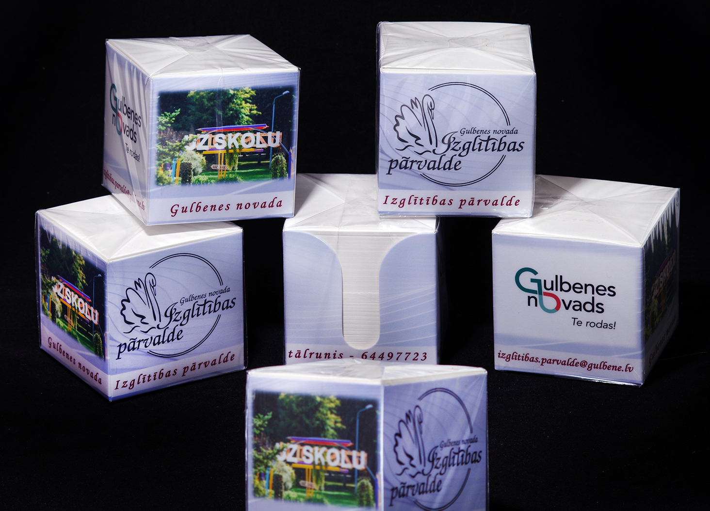 Fotokubi – ar kvalitatīvu fotoprinteri apdrukājam fotopapīru, ielaminējam to izturīgā plēvē, izgatavojam kastīti un iepildām tajā apmēram 800 dažādās dzīves situācijās noderīgas 8x8 cm piezīmju lapiņas.Vismaz gadu uz Jums vajadzīgā galda atradīsies šis kubs. Pieredze rāda, ka šāds piezīmju lapiņu daudzums pietiek vismaz gadam un tās ir noderīgas pat lieliem bosiem. Vai varat pateikt, kur atrodas Jums pēdējā gada laikā sadāvinātās reklāmas krūzītes un pildspalvas? Labākajā gadījumā pie Jūsu bērniem. Bet šis kubs būs uz Jums vajadzīgā lēmuma pieņēmēja galda.