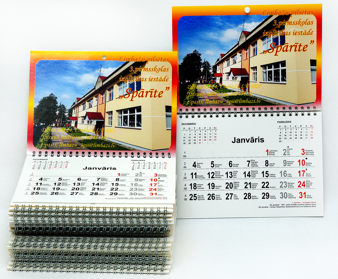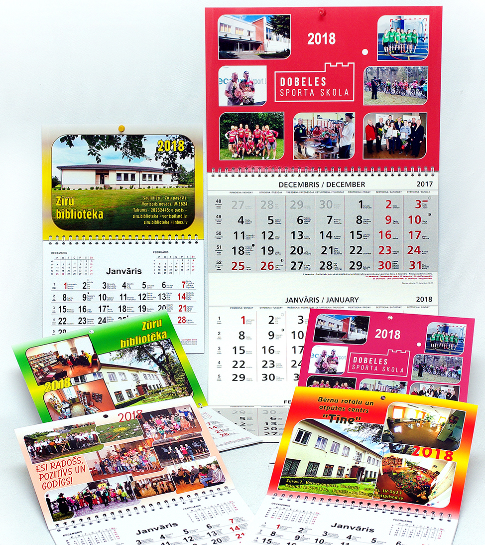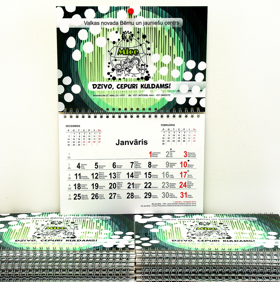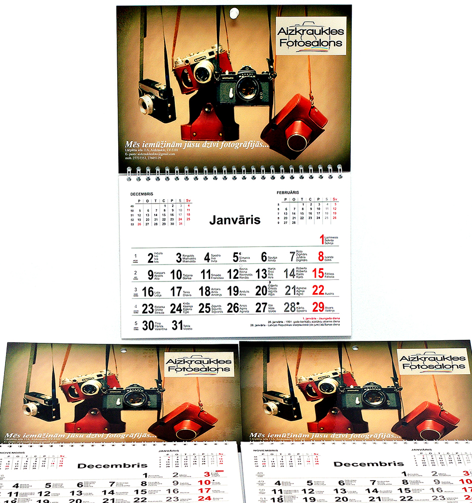 Sienas kalendāri ar noplēšamām mēnešu lapām.Kalendāra augšējo daļu - nemainīgu, vienu visam gadam - izgatavojam speciāli Jums - ar kvalitatīvu fotoprinteri apdrukājam A5 formāta (20,5 x 14,5 cm) fotopapīru, ielaminējam to izturīgā plēvē, izveidojam caurumu nostiprināšanai pie sienas. Jebkurš Jūsu izvēlēts teksts un bilde (arī vairāku attēlu kolāža) var būt uz mūsu ražotā kalendāra! Par autortiesību ievērošanu gan jāatbild Jums. Apakšējā daļa (arī 20,5x14,5 cm) - ar spirāli piestiprinātas standarta kalendāra 12 mēnešu lapas (nodrukātas lielā tirāžā lielā tipogrāfijā) un kartona pamatne. Cena ar PVN ir 2,25 eiro, minimālais pasūtījums - 20 eksemplāri. Paveiktais