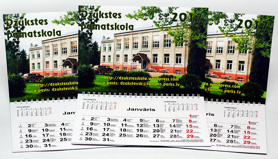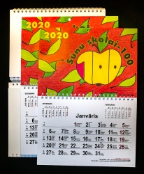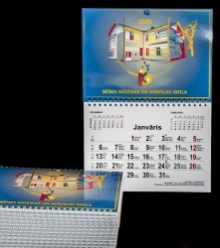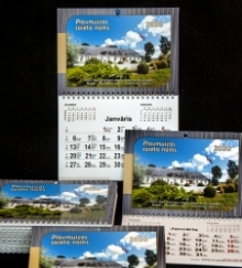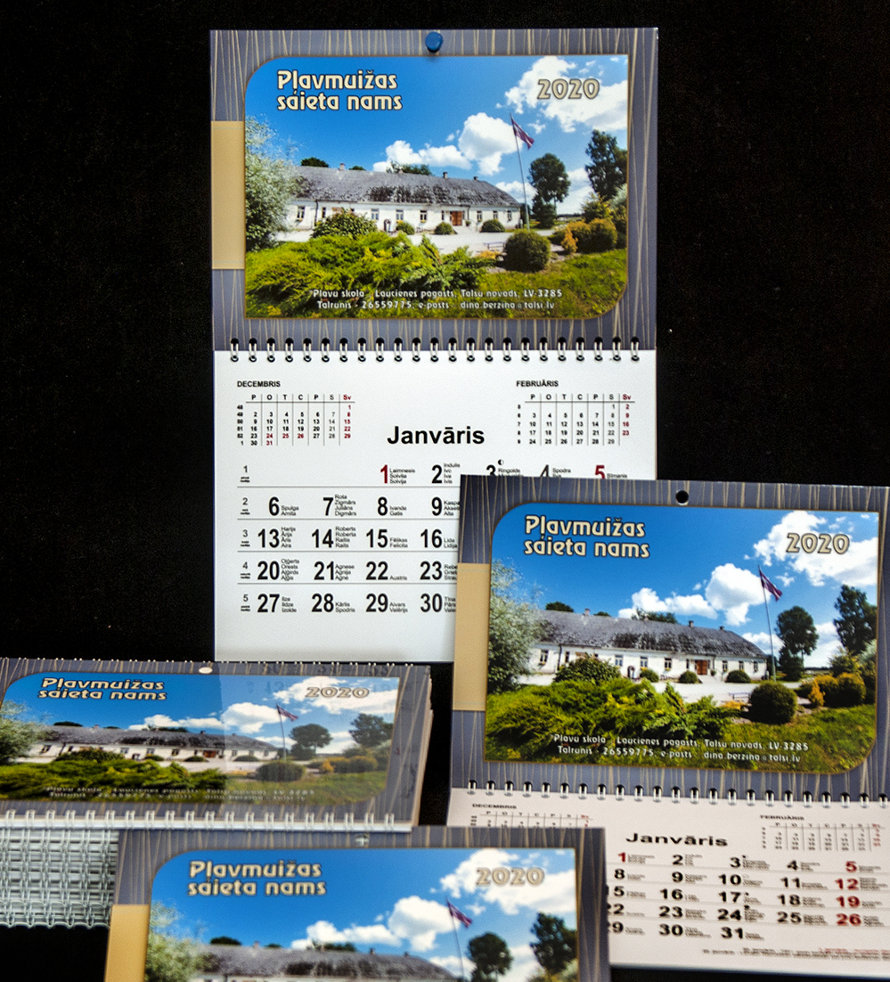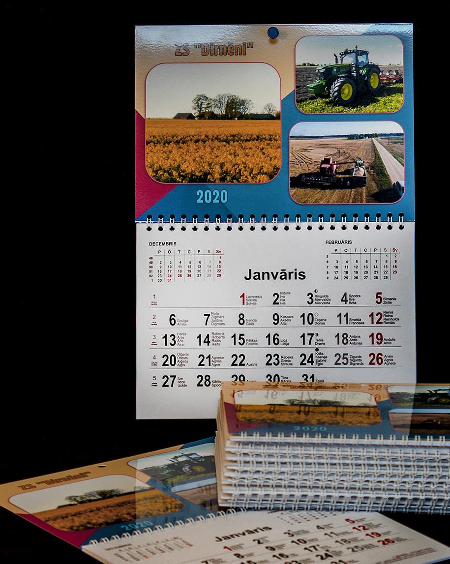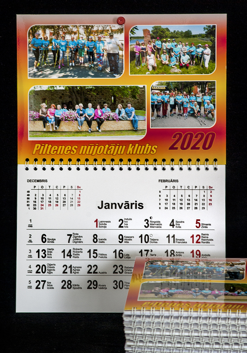 Sienas kalendāri ar noplēšamām mēnešu lapām.Kalendāra augšējo daļu - nemainīgu, vienu visam gadam - izgatavojam speciāli Jums - ar kvalitatīvu fotoprinteri apdrukājam A5 formāta (20,5 x 14,5 cm) fotopapīru, ielaminējam to izturīgā plēvē, izveidojam caurumu nostiprināšanai pie sienas. Jebkurš Jūsu izvēlēts teksts un bilde (arī vairāku attēlu kolāža) var būt uz mūsu ražotā kalendāra! Par autortiesību ievērošanu gan jāatbild Jums. Apakšējā daļa (arī 20,5x14,5 cm) - ar spirāli piestiprinātas standarta kalendāra 12 mēnešu lapas (nodrukātas lielā tirāžā lielā tipogrāfijā) un kartona pamatne. Cena ar PVN ir 2,25 eiro, minimālais pasūtījums - 20 eksemplāri. Paveiktais