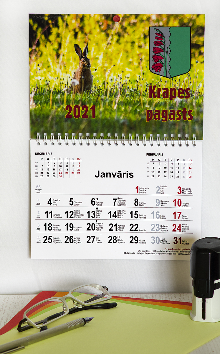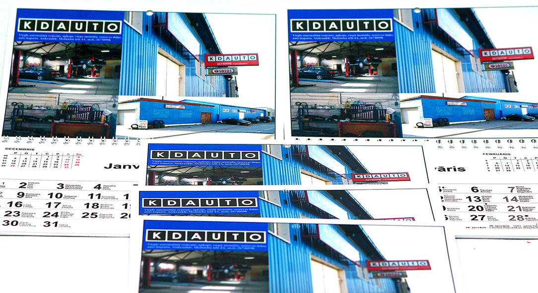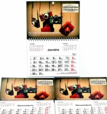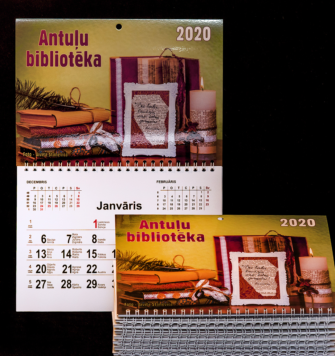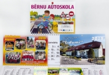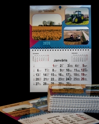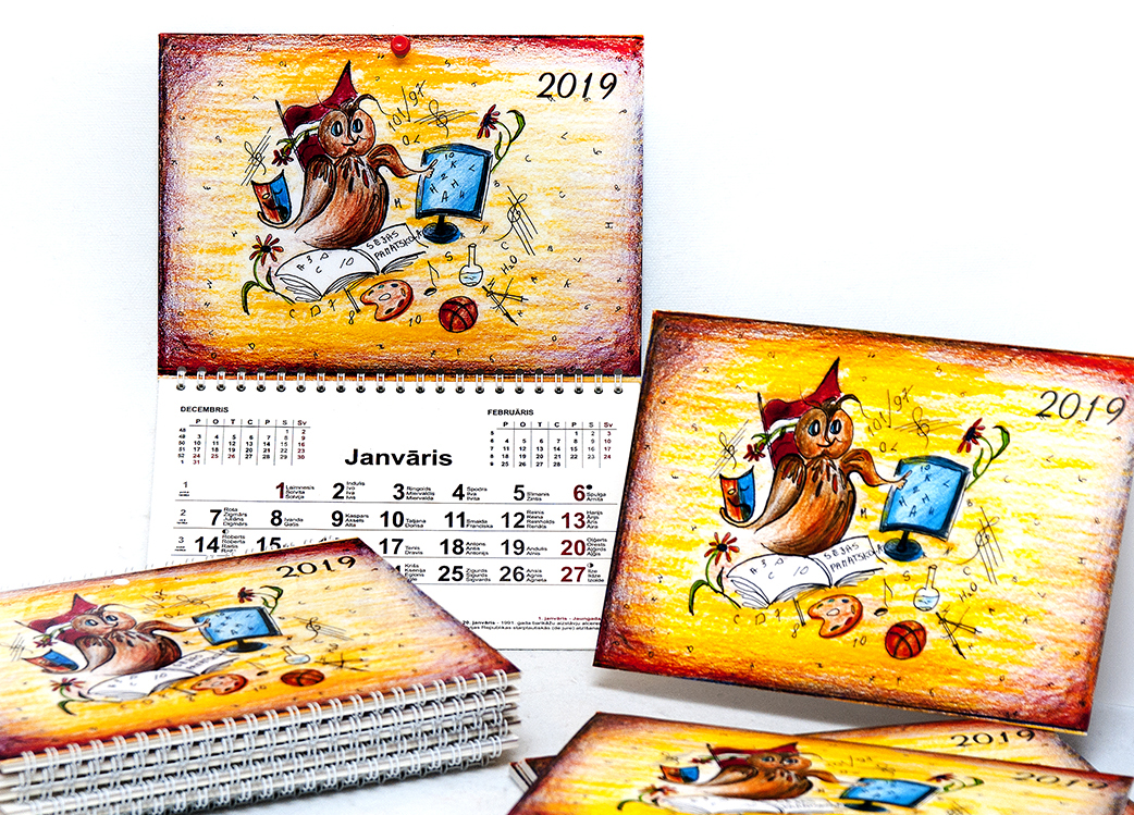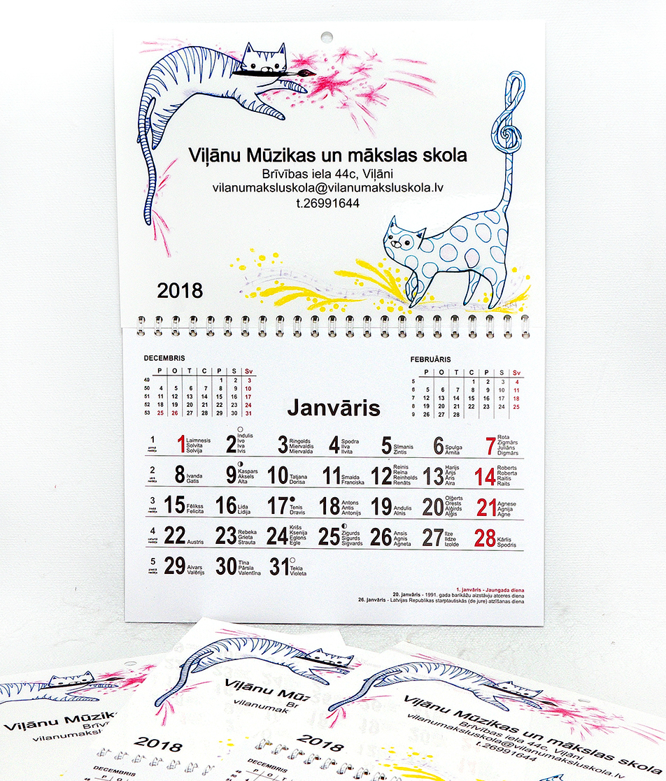Sienas kalendāri ar noplēšamām mēnešu lapām.Kalendāra augšējo daļu - nemainīgu, vienu visam gadam - izgatavojam speciāli Jums - ar kvalitatīvu fotoprinteri apdrukājam A5 formāta (20,5 x 14,5 cm) fotopapīru, ielaminējam to izturīgā plēvē, izveidojam caurumu nostiprināšanai pie sienas. Jebkurš Jūsu izvēlēts teksts un bilde (arī vairāku attēlu kolāža) var būt uz mūsu ražotā kalendāra! Par autortiesību ievērošanu gan jāatbild Jums. Apakšējā daļa (arī 20,5x14,5 cm) - ar spirāli piestiprinātas standarta kalendāra 12 mēnešu lapas (nodrukātas lielā tirāžā lielā tipogrāfijā) un kartona pamatne. Cena ar PVN ir 2,25 eiro, minimālais pasūtījums - 20 eksemplāri. Paveiktais