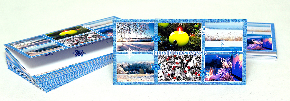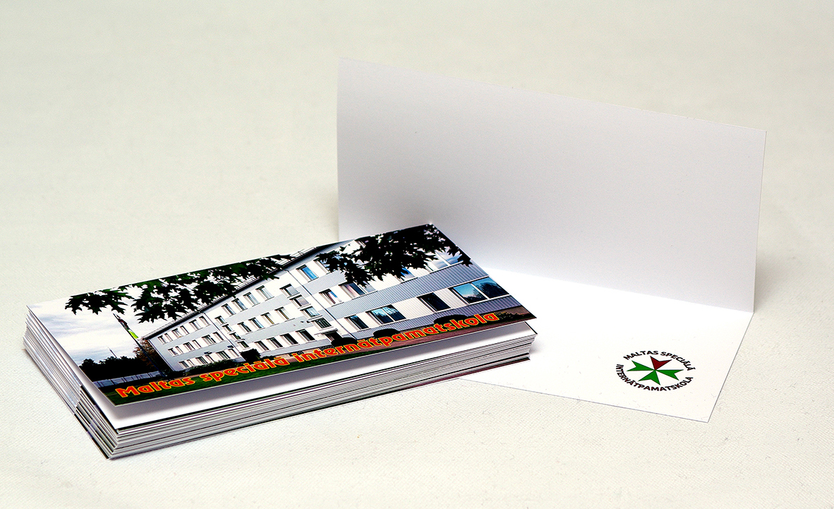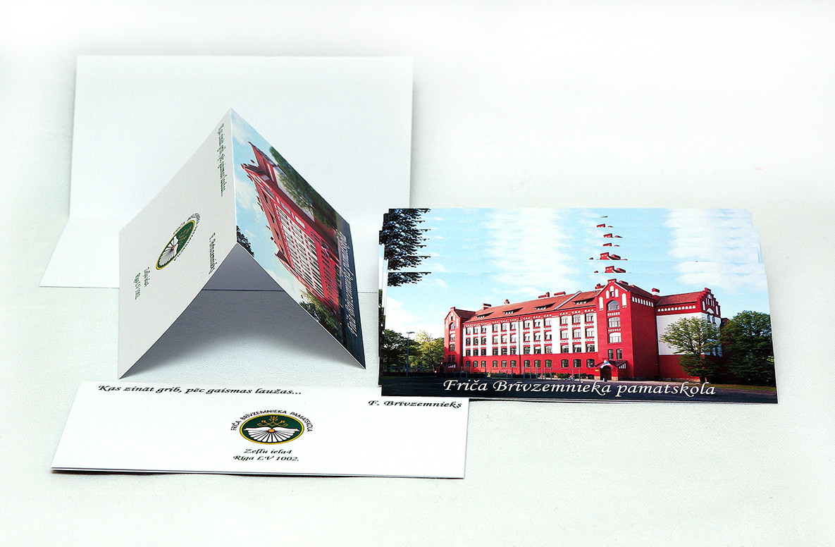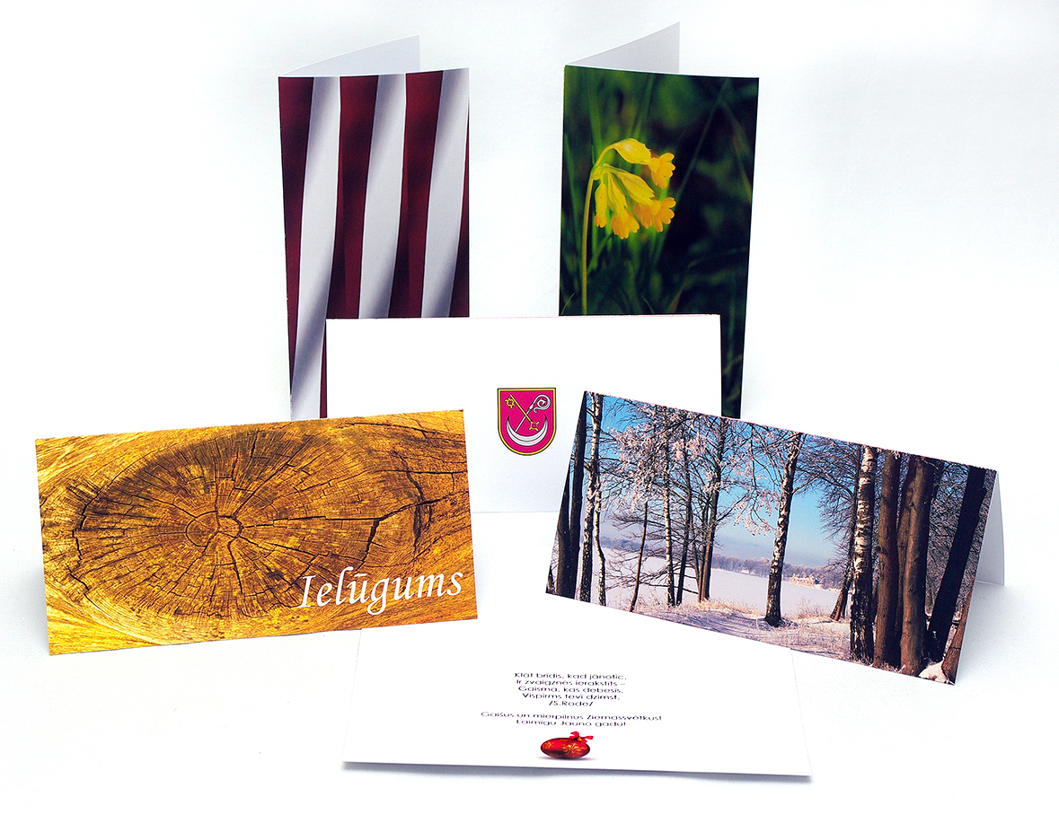 Kartītes – ielūgumiem, apsveikumiem, pateicībām un nenoskārstai vajadzībai. Salocīta kartīte ir izmērā 20x10 vai 14x10 cm (atvērtā veidā attiecīgi - 20x20 vai 14x20 cm). Kartītes drukājam uz divpusēja matēta 240 gr fotopapīra . Iespējams gan vertikāls gan horizontāls izkārtojums. Minimālais pasūtījums - 20 eksemplāri.