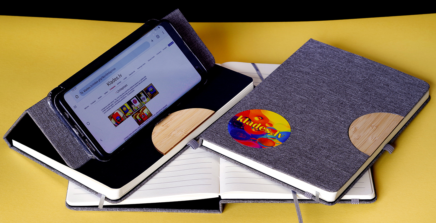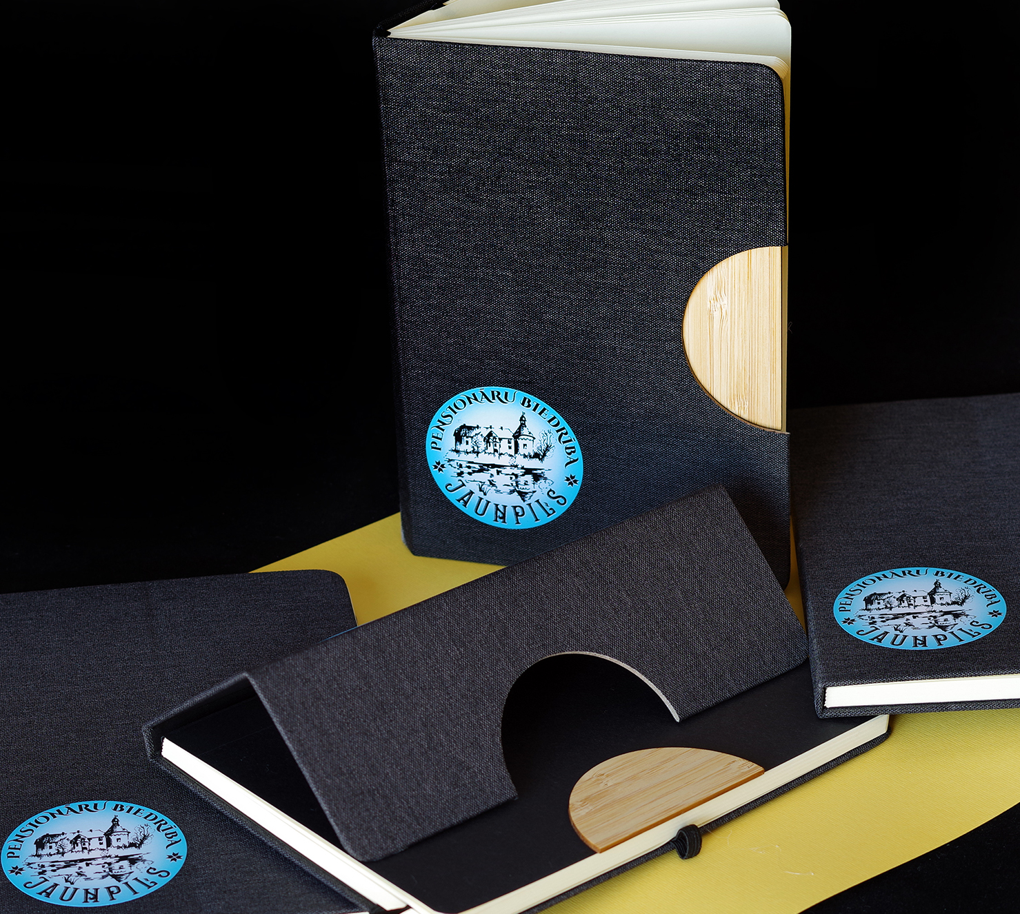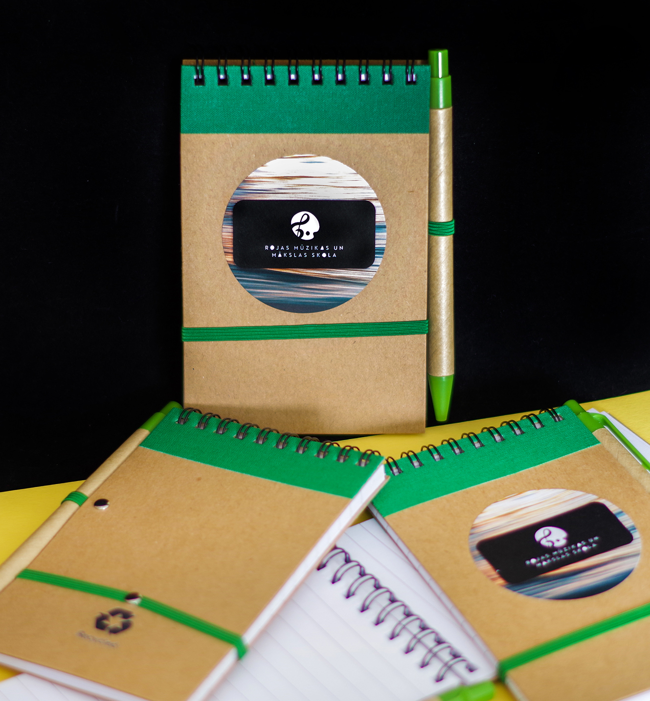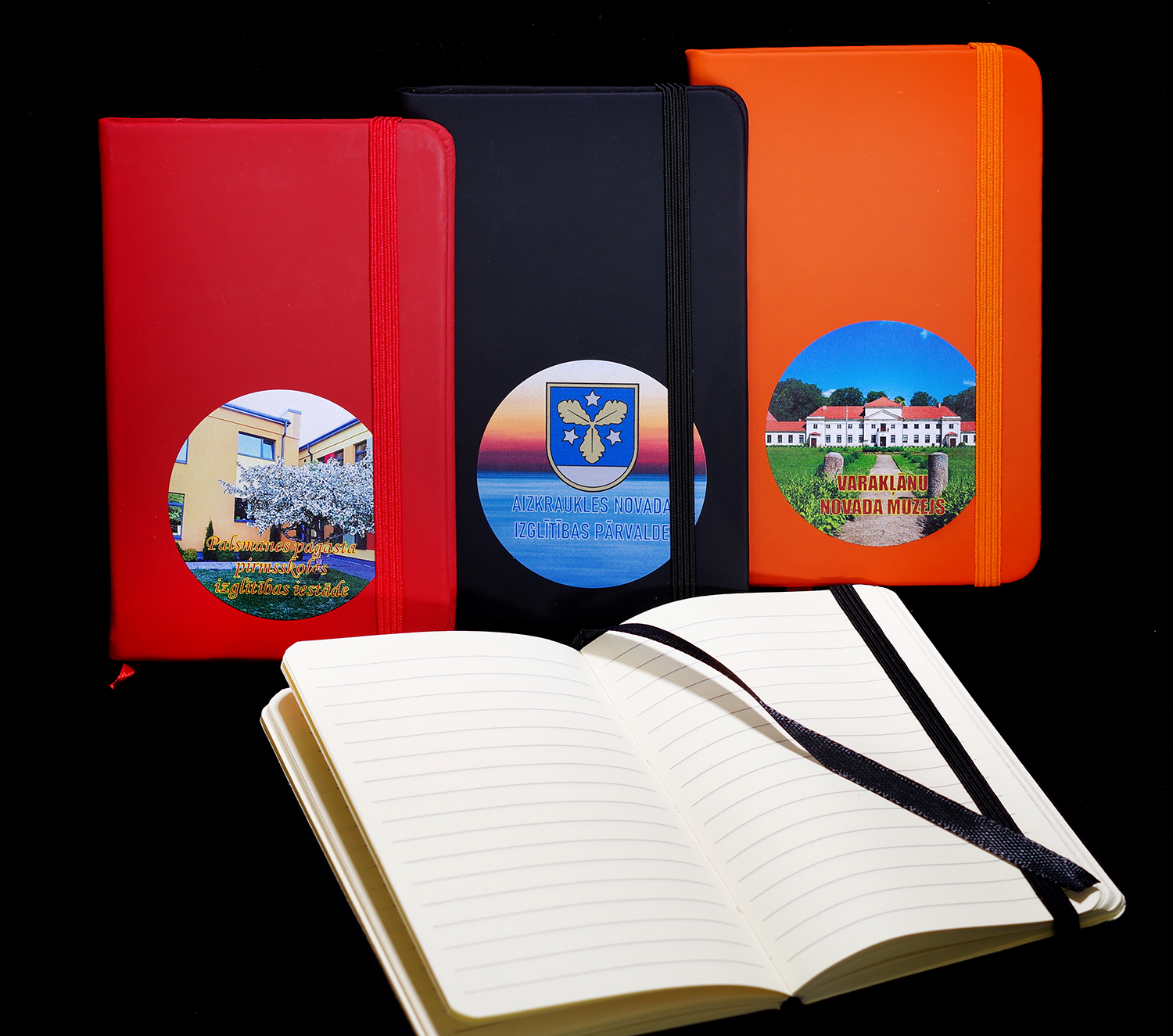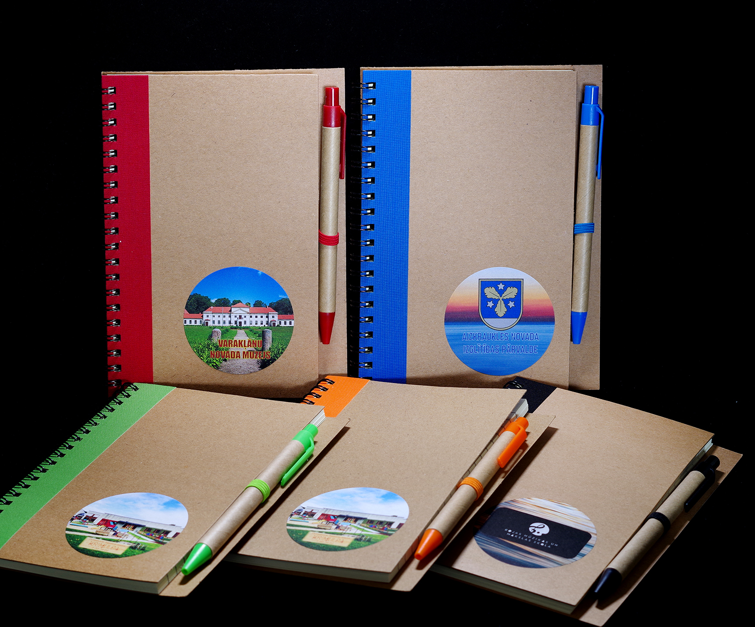 • Klades ar uzlīmi uz pirmā vāka![]() 1. Ar spirāli sastiprinātas 70 līniju lapas un kartona vāki, kam piestiprināta pildspalva un gumija vāku noturēšanai. 2. Cietajos vākos iesieta piezīmju grāmatiņa ar 96 līniju lapām. Pieskārienam patīkams vāka materiāls, lentīte kā grāmatzīme un gumija aizvēršanas fiksācijai. Cenas ar PVN par vienu blociņu atkarā no pasūtītā daudzuma: