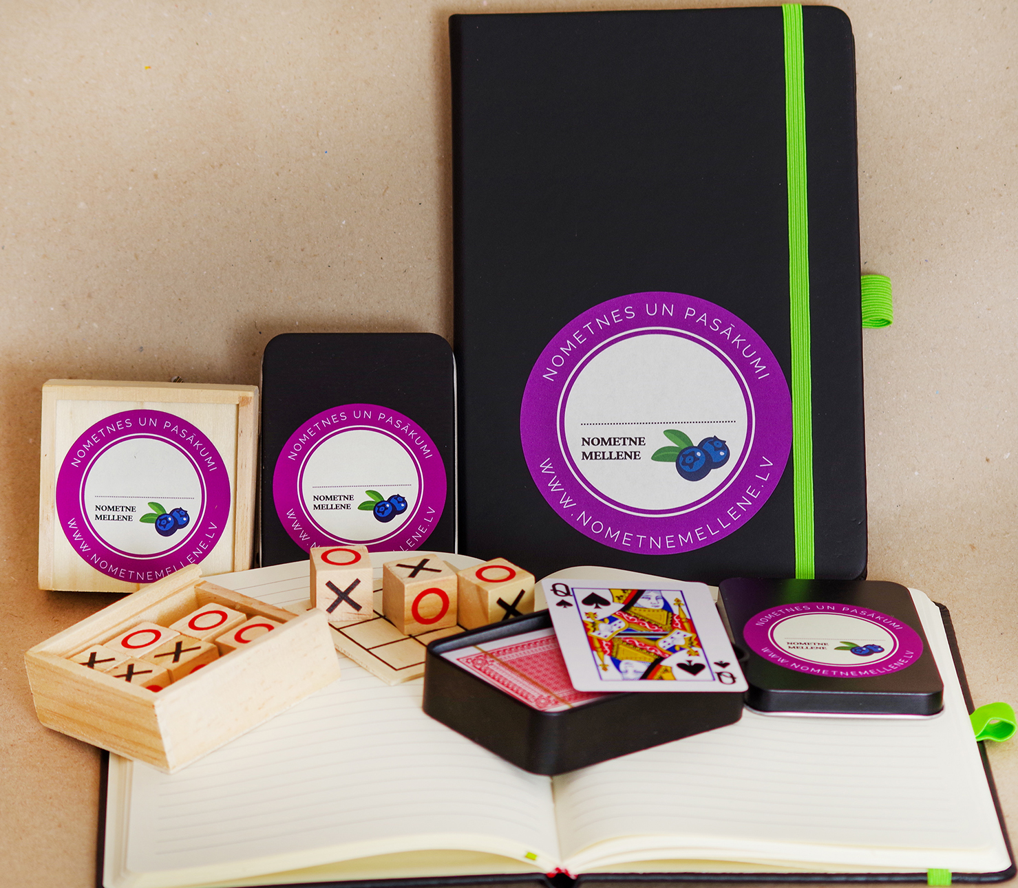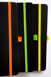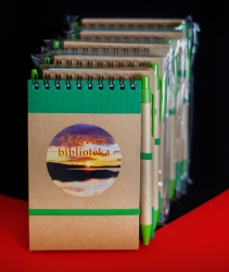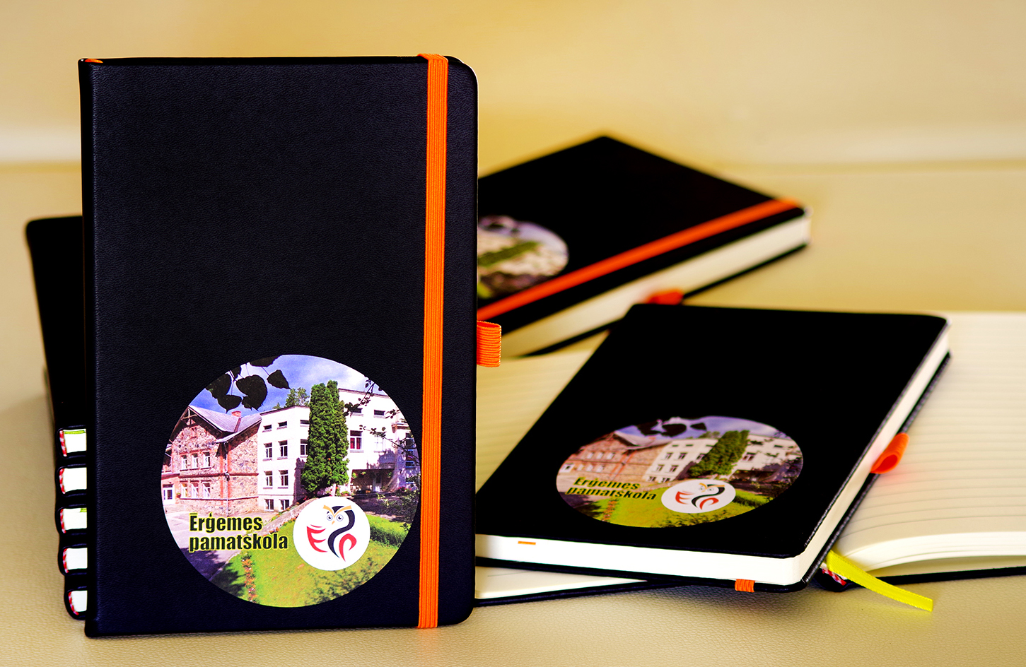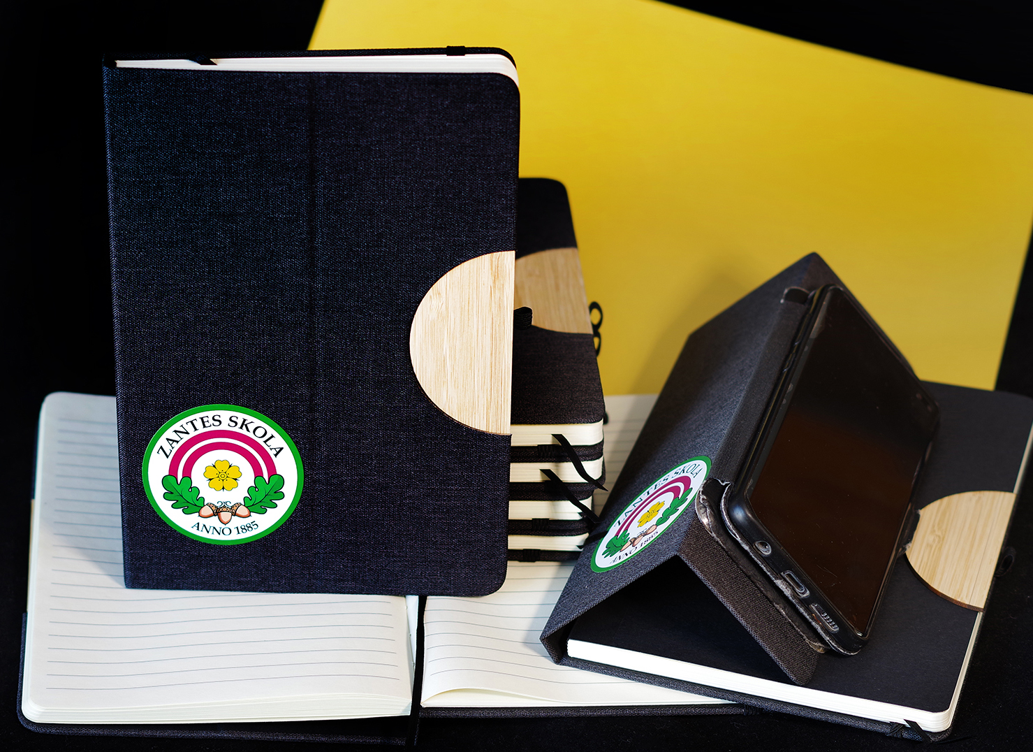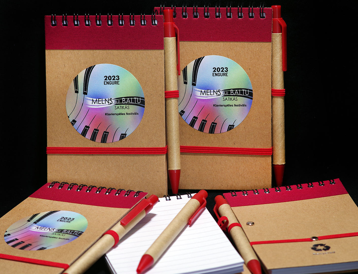 • Klades ar uzlīmi uz pirmā vāka![]() 1. Ar spirāli sastiprinātas 70 līniju lapas un kartona vāki, kam piestiprināta pildspalva un gumija vāku noturēšanai. 2. Cietajos vākos iesieta piezīmju grāmatiņa ar 96 līniju lapām. Pieskārienam patīkams vāka materiāls, lentīte kā grāmatzīme un gumija aizvēršanas fiksācijai. Cenas ar PVN par vienu blociņu atkarā no pasūtītā daudzuma:
