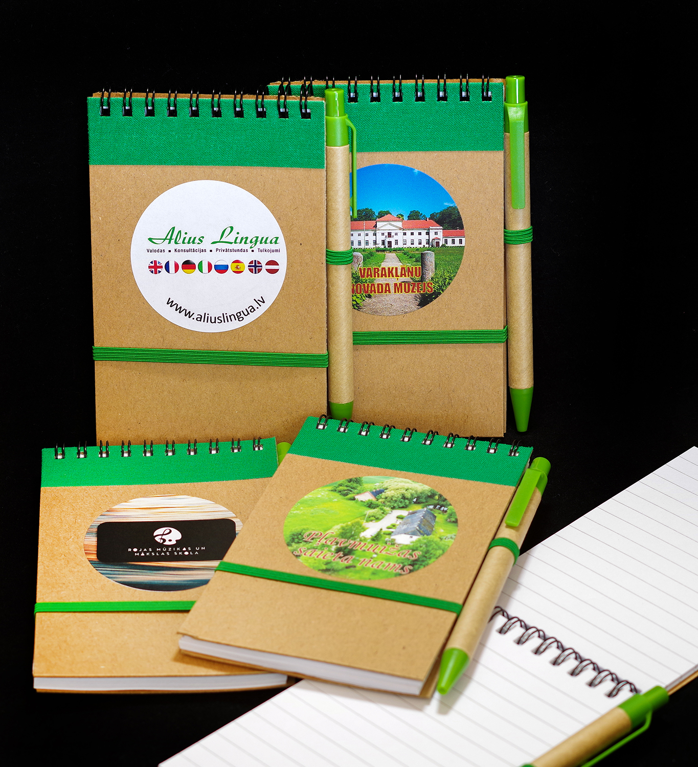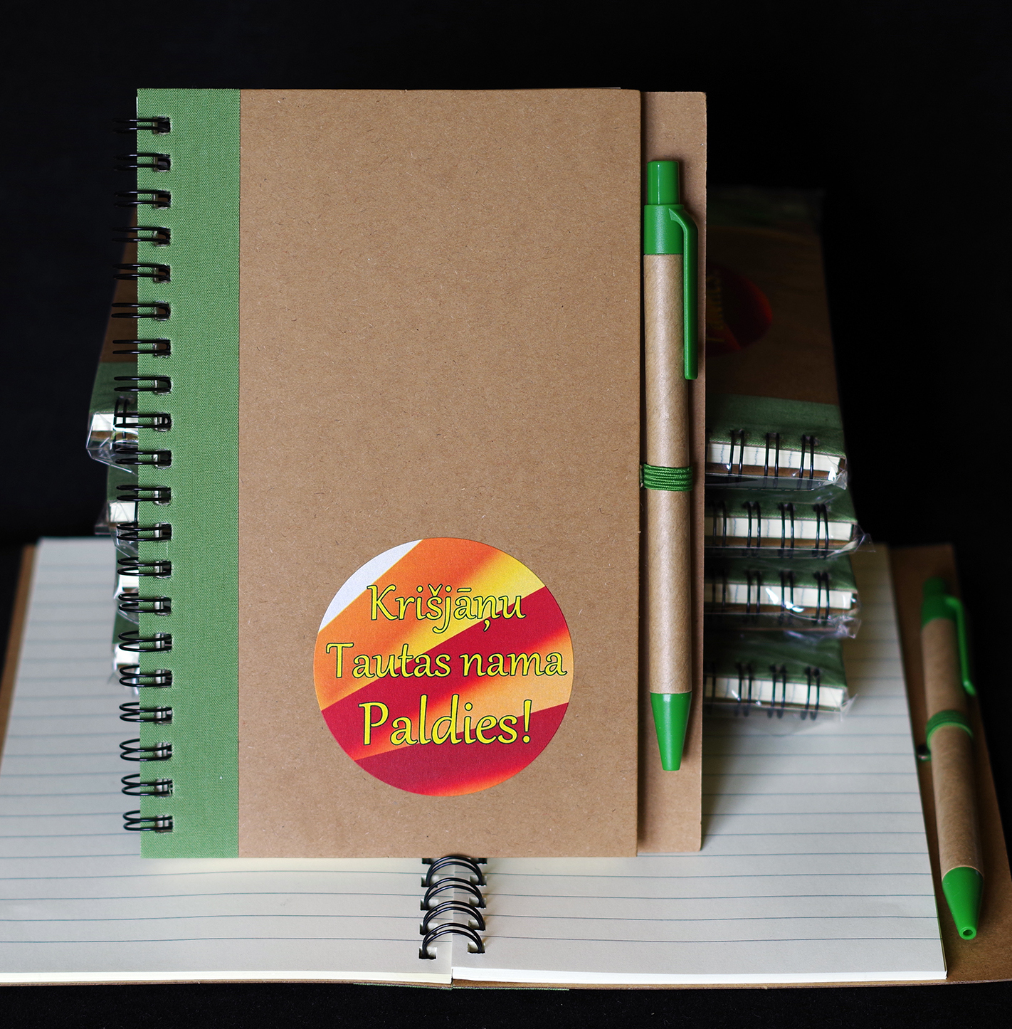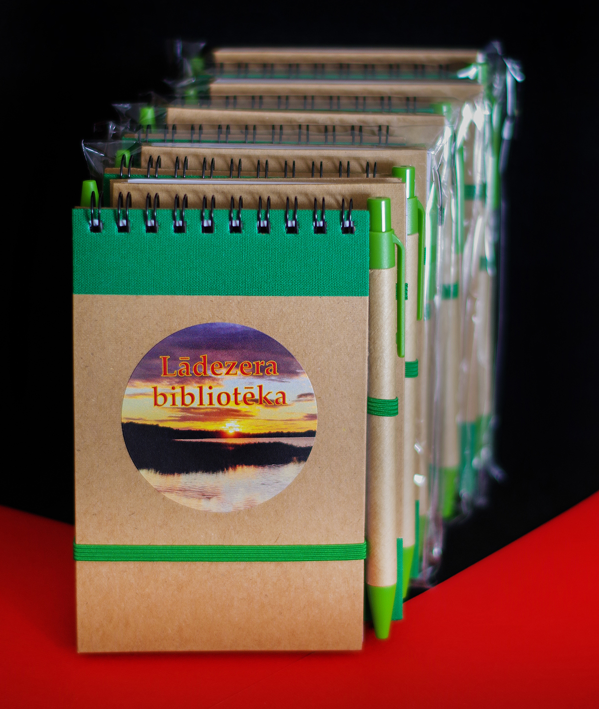 ■ Klade izmērā 13,7x18 cm ar 60 līniju lapām un vākiem no pārstrādātā kartona, kam piestiprināta pildspalva. Katra klade iesaiņota caurspīdīgā maisiņā. Jums drukāta uzlīme 60mm diametrā. Cenas ar PVN par vienu kladi atkarā no pasūtītā daudzuma: