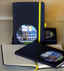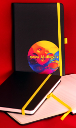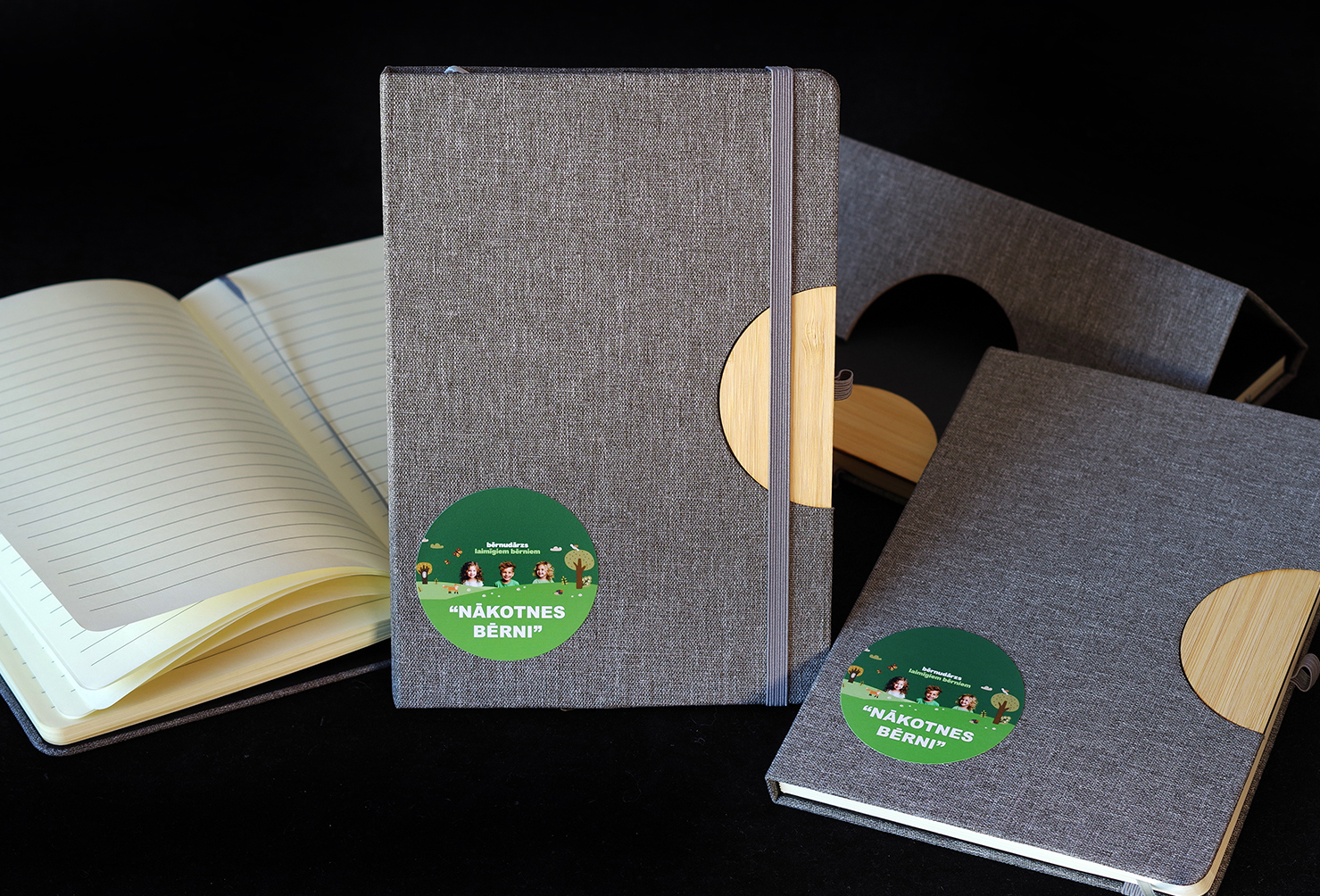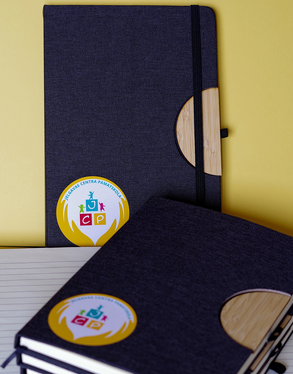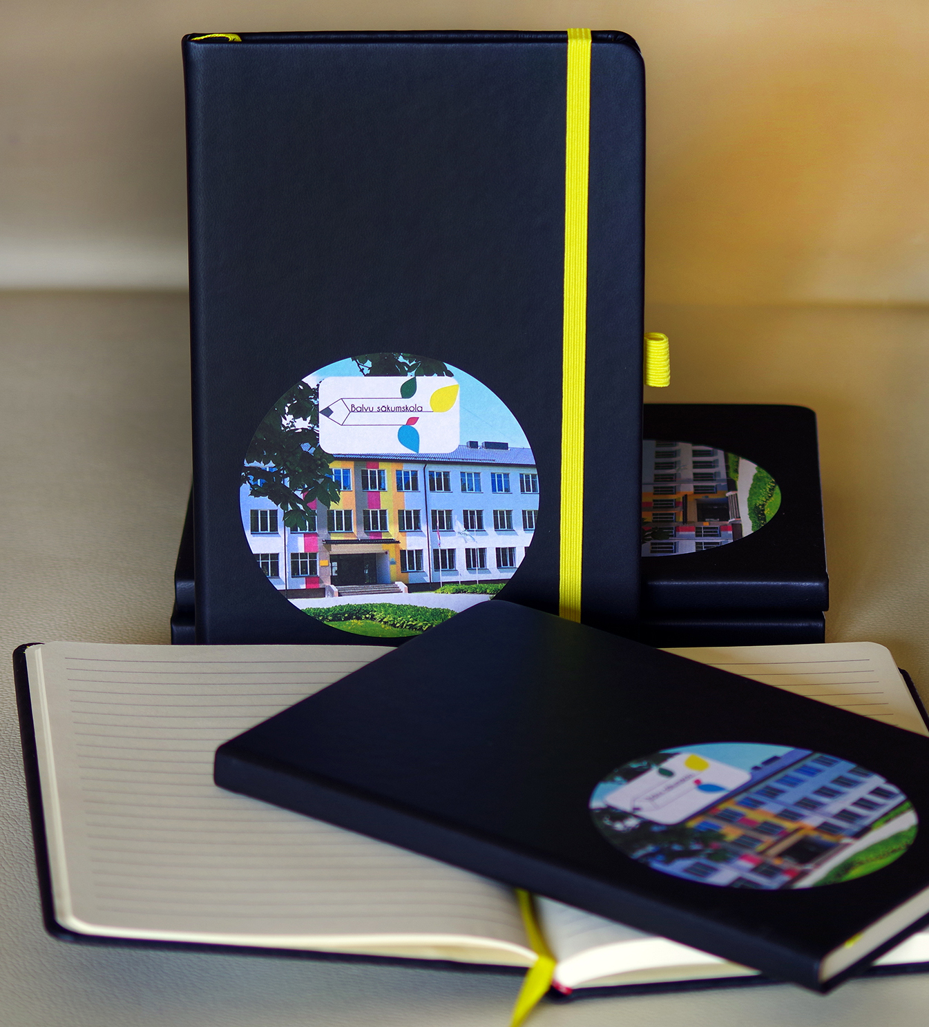■ Pierakstu klade cietajos vākos, A5 formāts (14,5x21 cm), 96 iekšlapas no 70 gr. papīra, apdrukātas ar līnijām. Pieskārienam patīkams vāka materiāls melnā krāsā, elastīga gumija aizvēršanas fiksācijai un pildspalvai, pieskaņotas krāsas grāmatzīme. Un tieši Jums drukāta uzlīme 9,5 cm diametrā. Cenas ar PVN par vienu kladi atkarā no pasūtītā daudzuma: