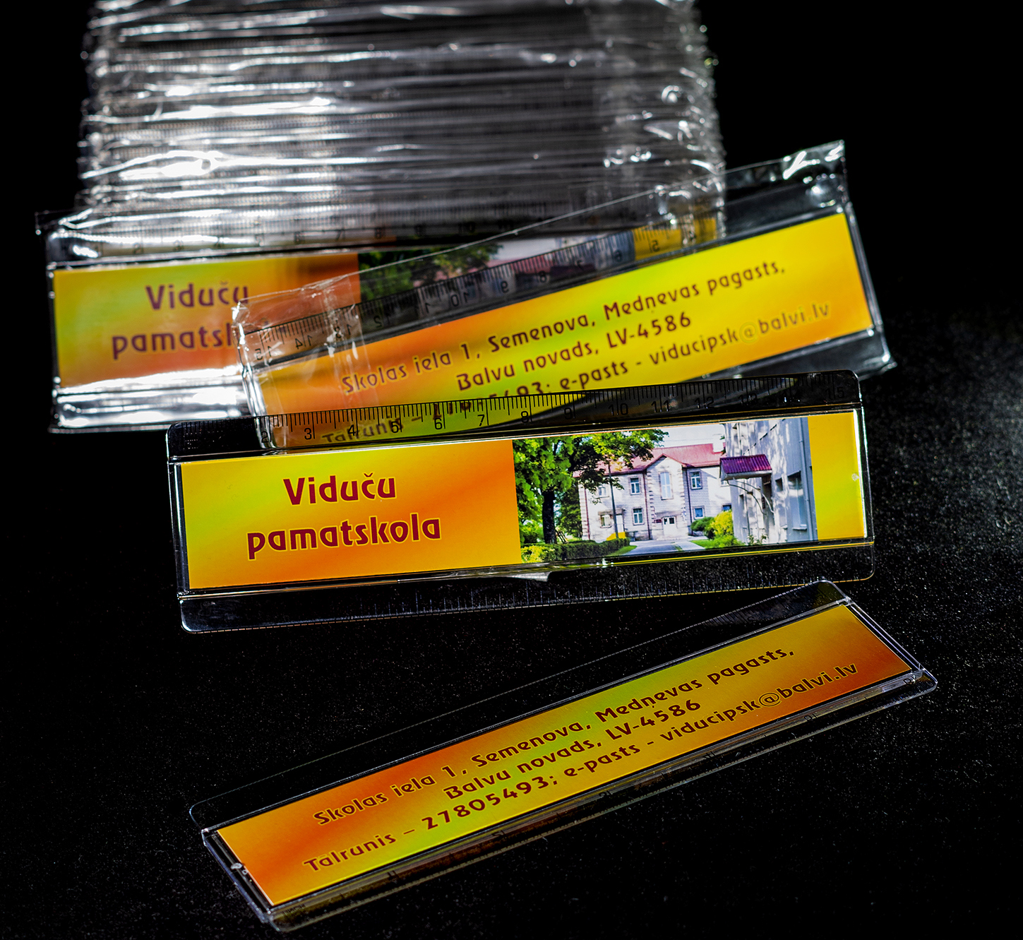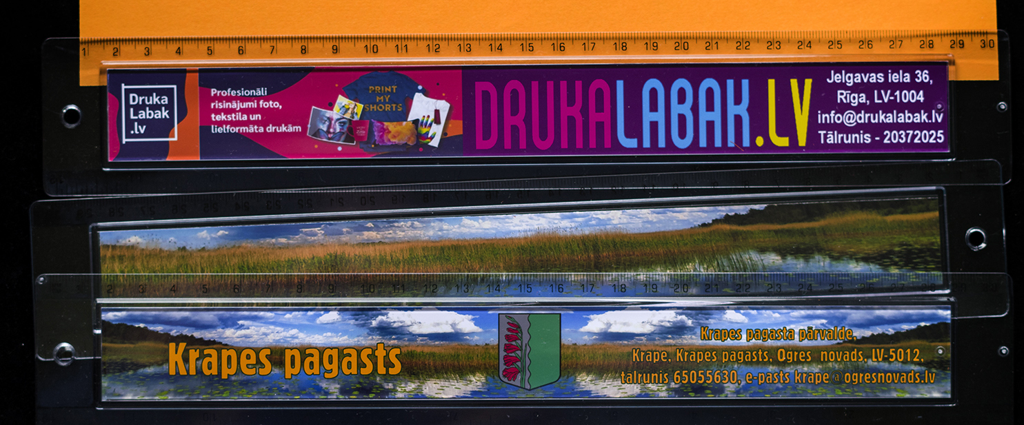 • Lineāli30 cm lineāls ar ievietojamā attēla izmēru 270x29 mm katrā pusē. 15 cm lineāls ar ievietojamā attēla izmēru 155x29 mm katrā pusē. Katrs lineāls iesaiņots caurspīdīgā maisiņā. Minimālais pasūtījums – 20 lineāli.